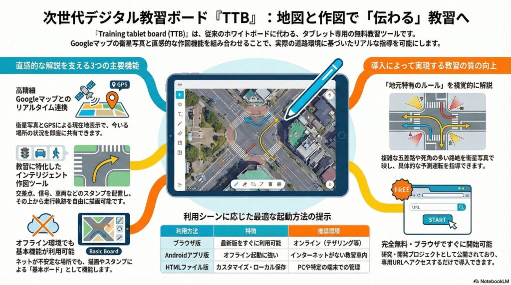 教習指導員の皆様、日々の教習お疲れ様です。現場での「伝わりやすさ」を追求して開発した、タブレット用デジタル教習ボード『Training tablet board(TTB)』を無料公開いたします。本アプリは、従来のホワイトボードや図面では難しかった「実際の道路環境に基づいた解説」を、タブレット一台で直感的に行えるツールです。